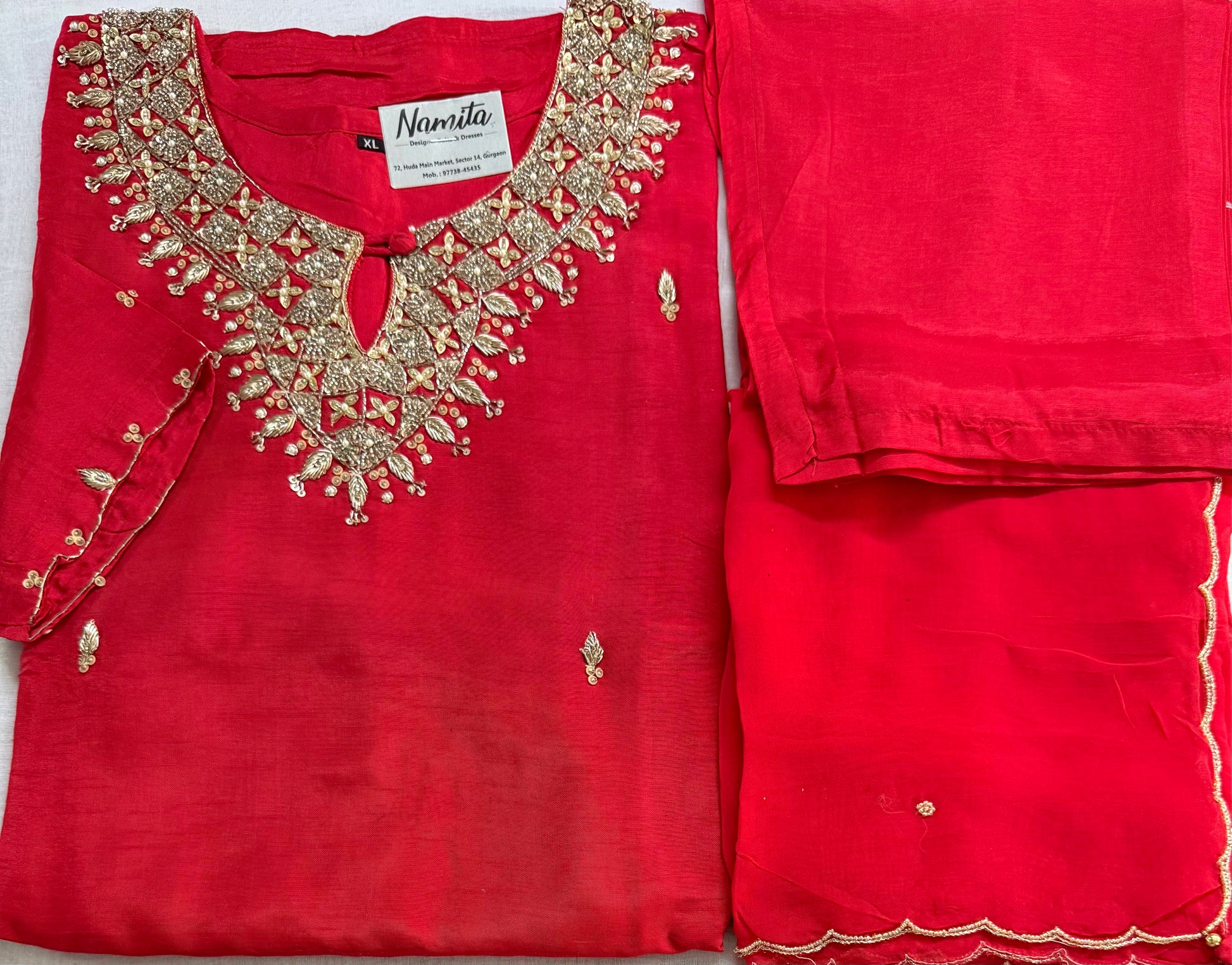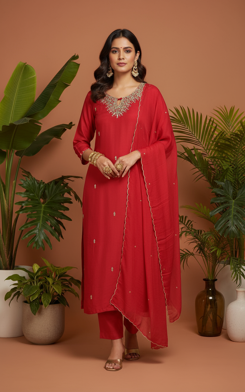 An elegant crimson set with timeless zardozi and sequin handwork, paired with sleek pants and a refined georgette dupatta — ideal for festive and party occasions.