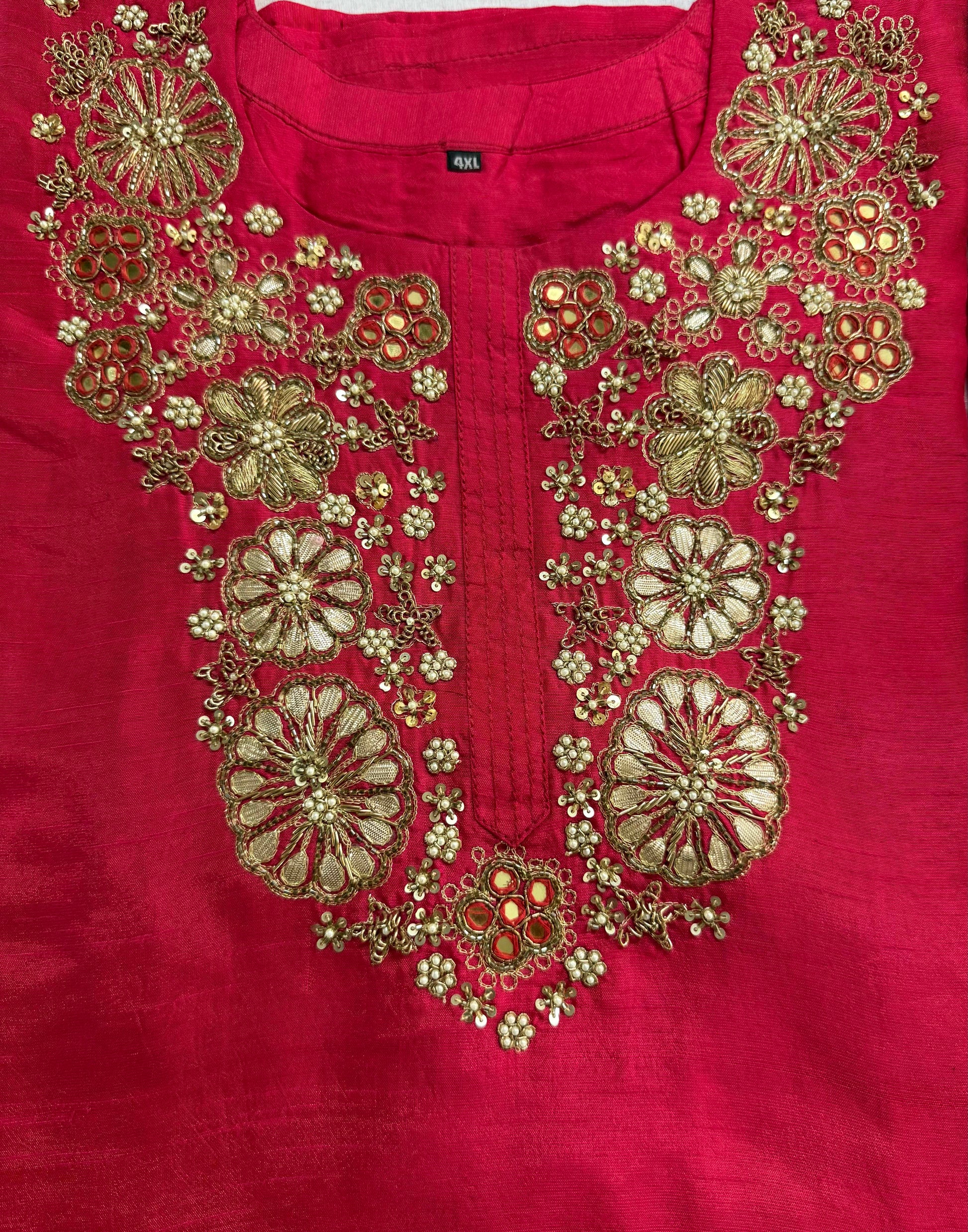 - Placket: Statement U-placket densely hand-worked with zardozi, mirrors & sequins in floral medallions