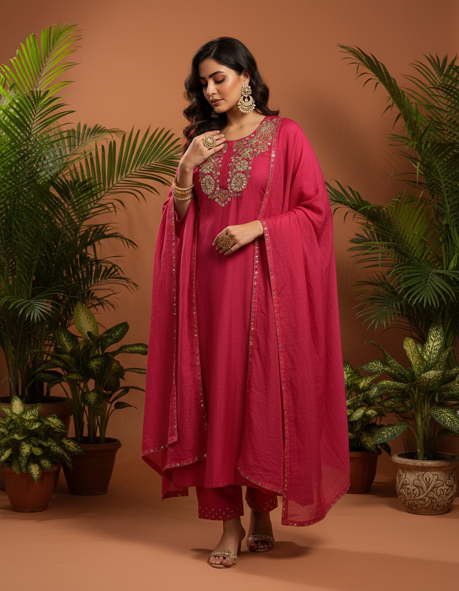 A sophisticated rose pink ensemble with intricate zardozi and mirror handwork, elegant straight pants, and a feather-light chanderi dupatta — perfect for festive elegance and refined celebrations.