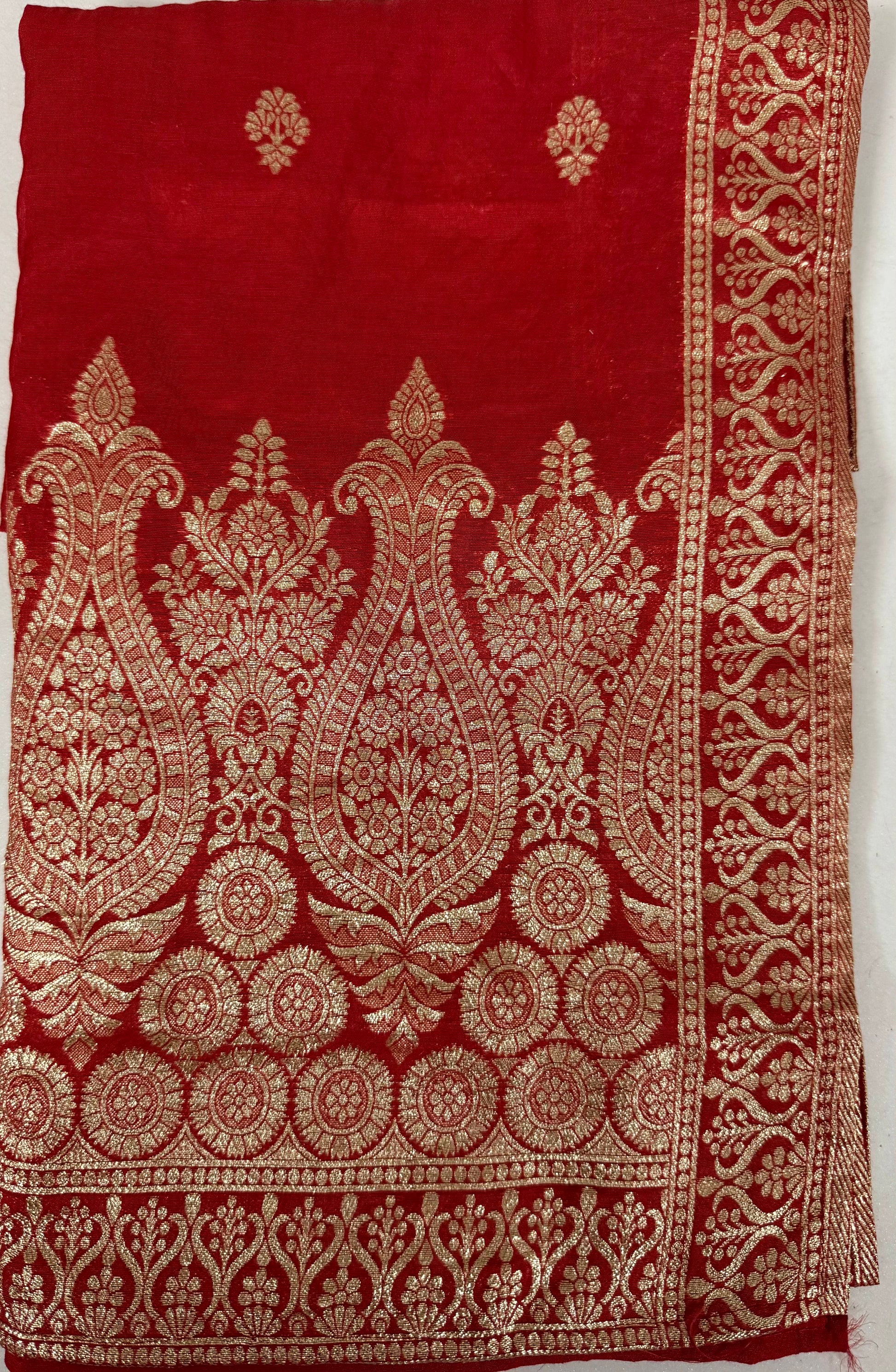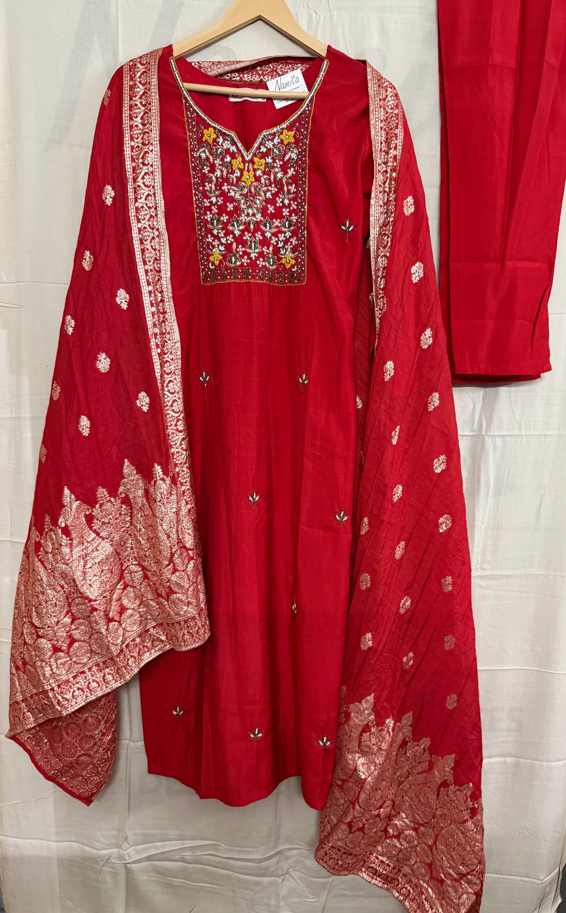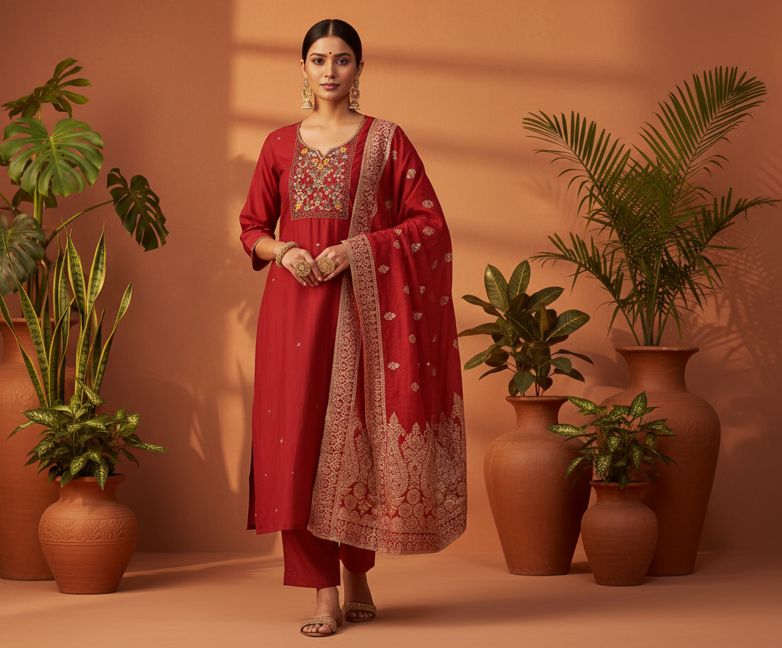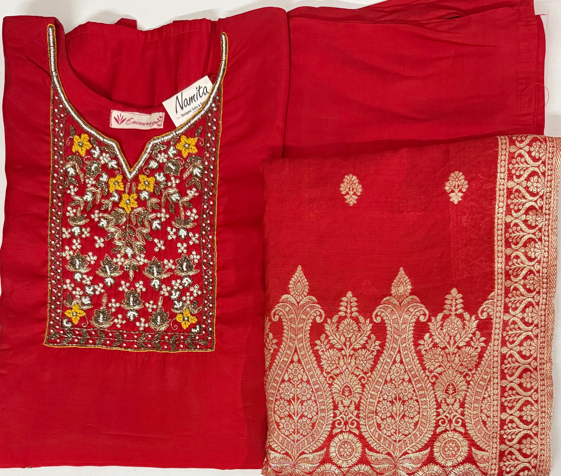 An exquisite unstitched suit set featuring detailed hand embroidery, rich cotton comfort, and a shimmering organza dupatta — designed for festive elegance and celebratory occasions.