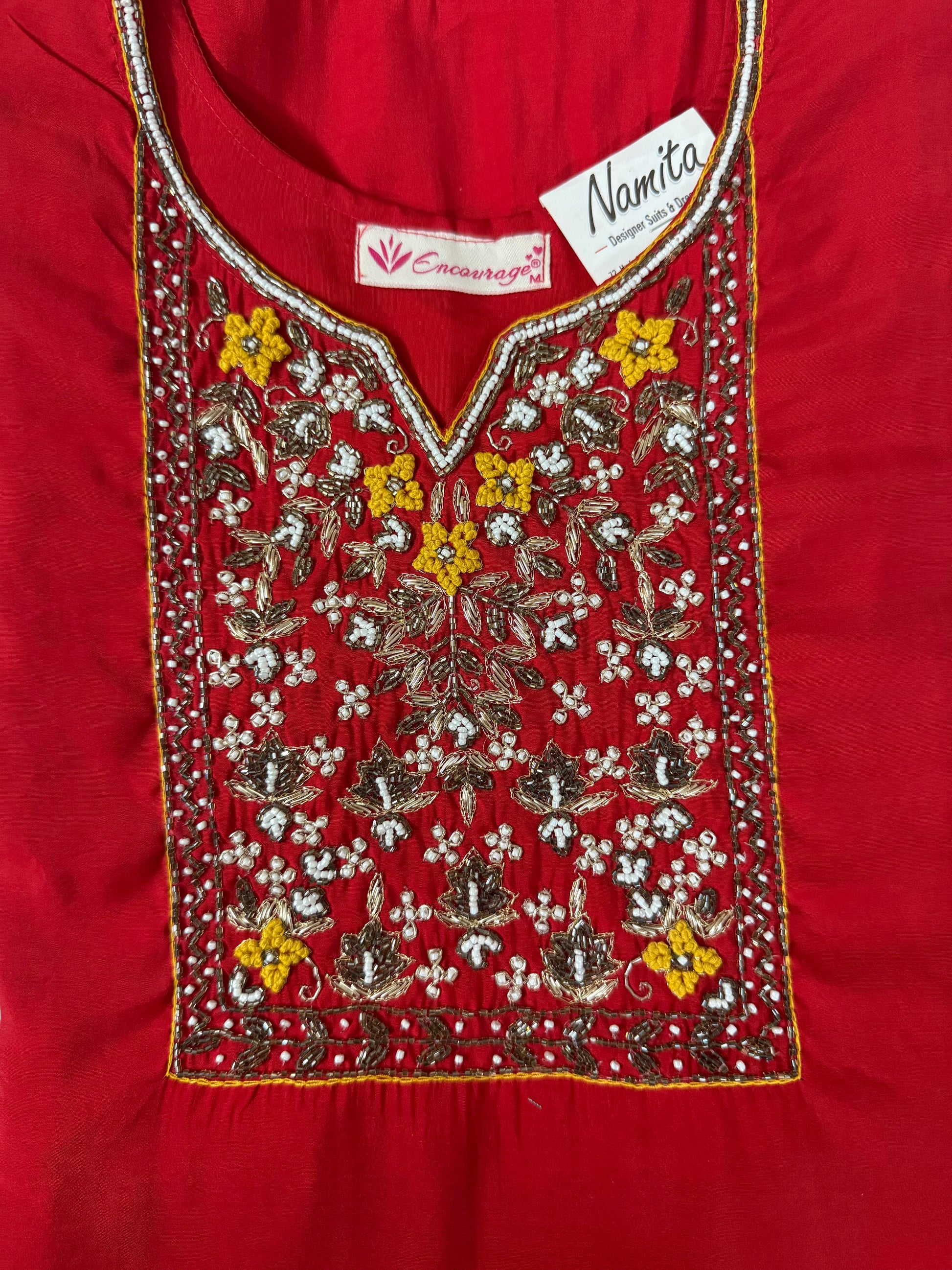 - Yoke: Intricate square yoke richly hand-embroidered with zari, sequins & tiny mirrors