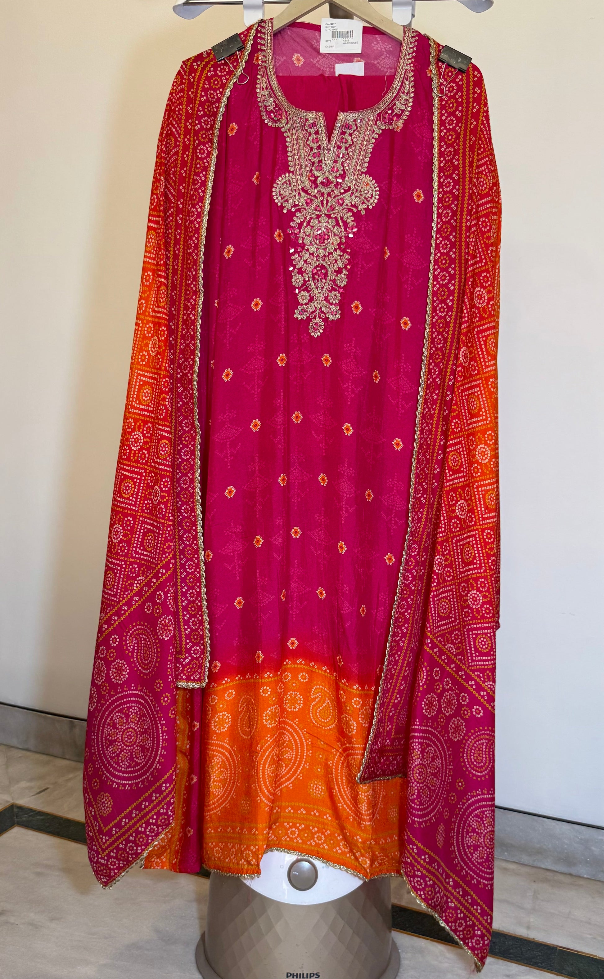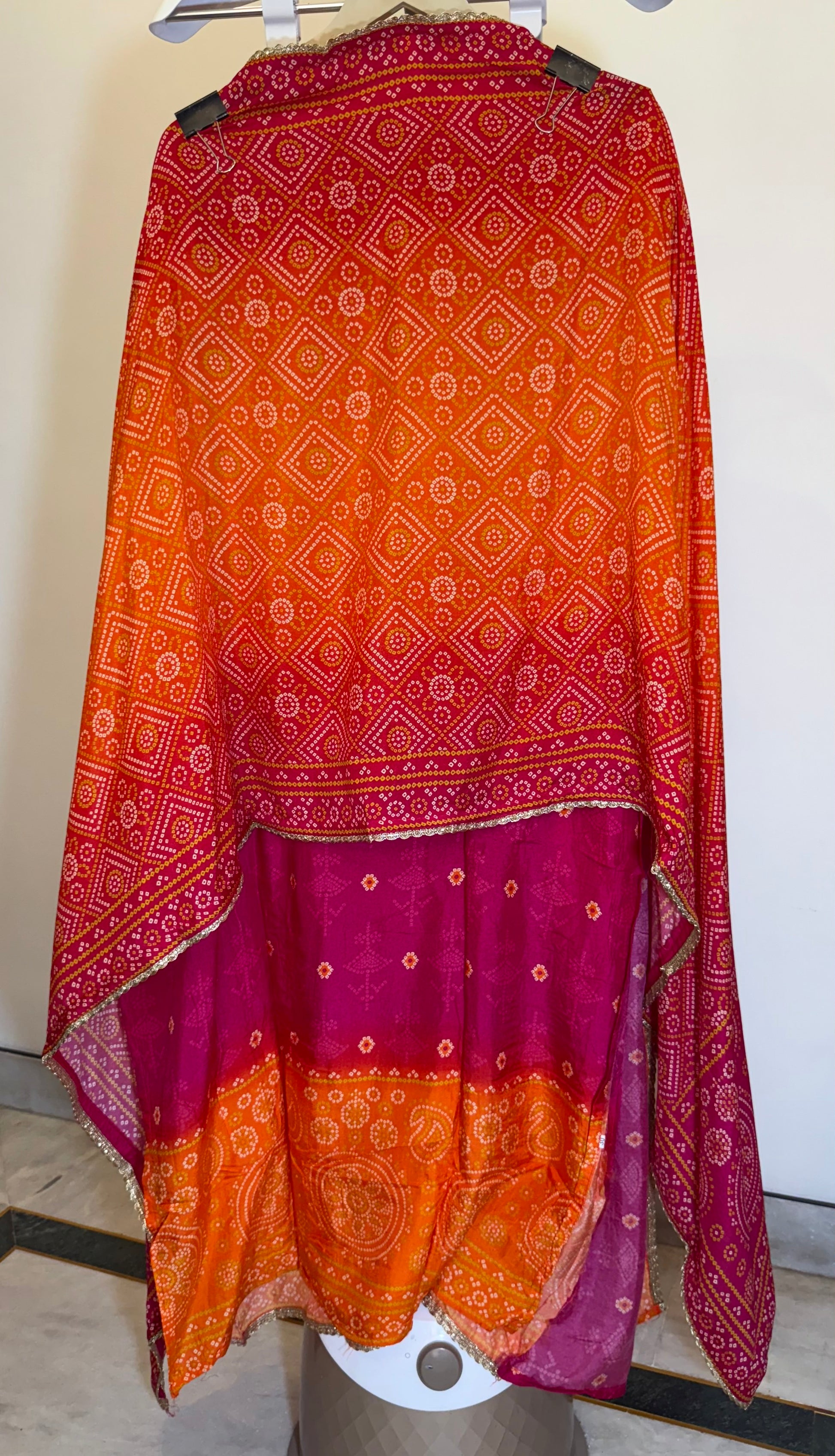 - Material: Ombre Bandhej organza dupatta fading from rani pink to fiery orange