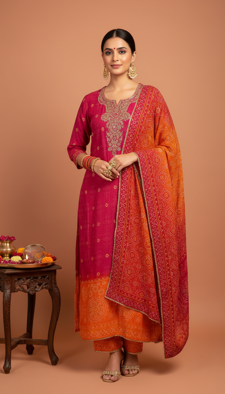 A vibrant unstitched shimmer cotton suit set featuring ornate embroidery, rich vermilion trousers, and an ombre Bandhej organza dupatta — crafted for festive elegance and timeless appeal.