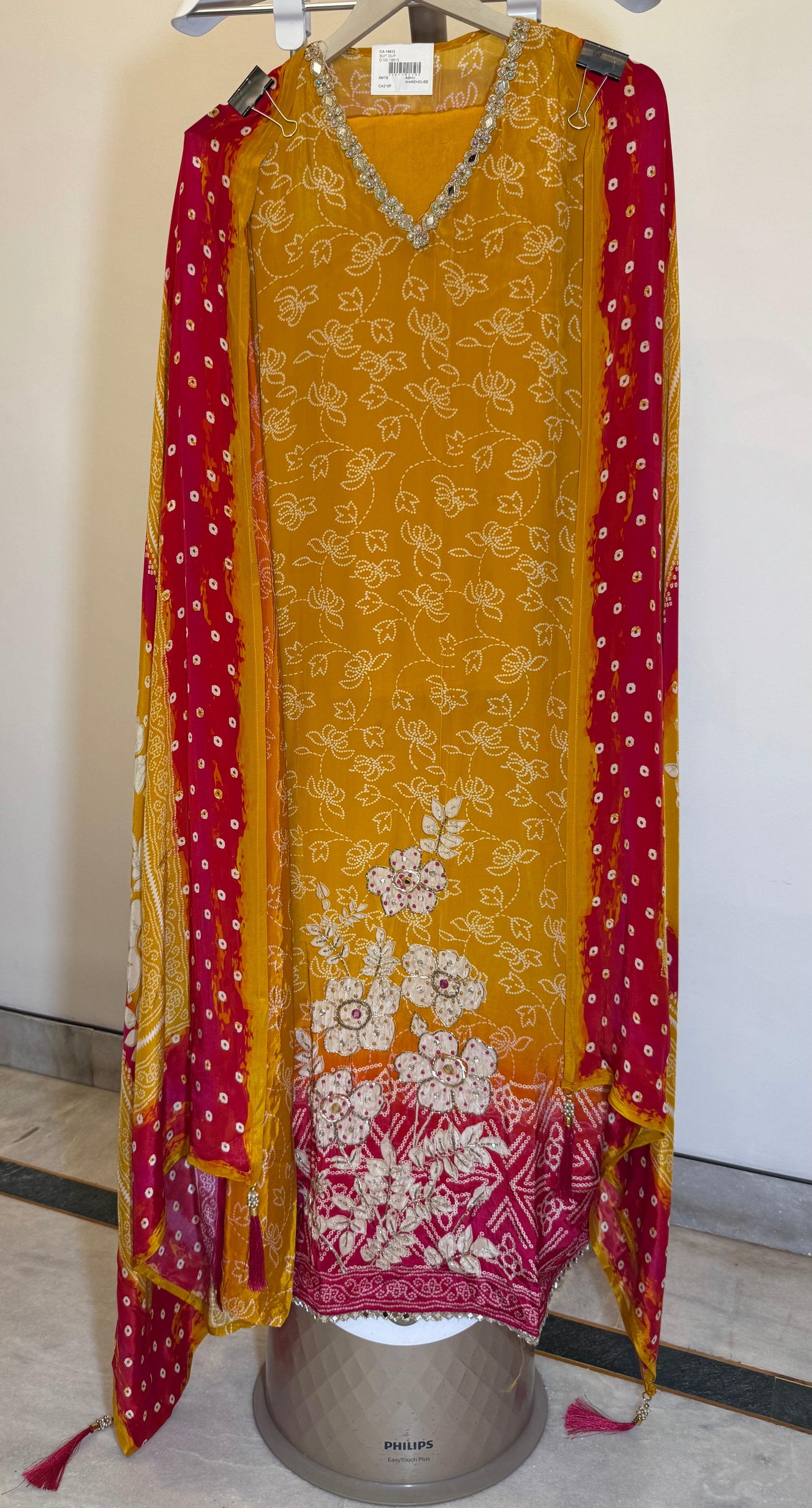 Women’s Unstitched Shimmer Cotton Suit Set with Sequin & Zari Hand-Embroidered Yoke | Solid Cotton Bottom & Bandhej Organza Dupatta with Floral Panels – Festive & Party Wear
