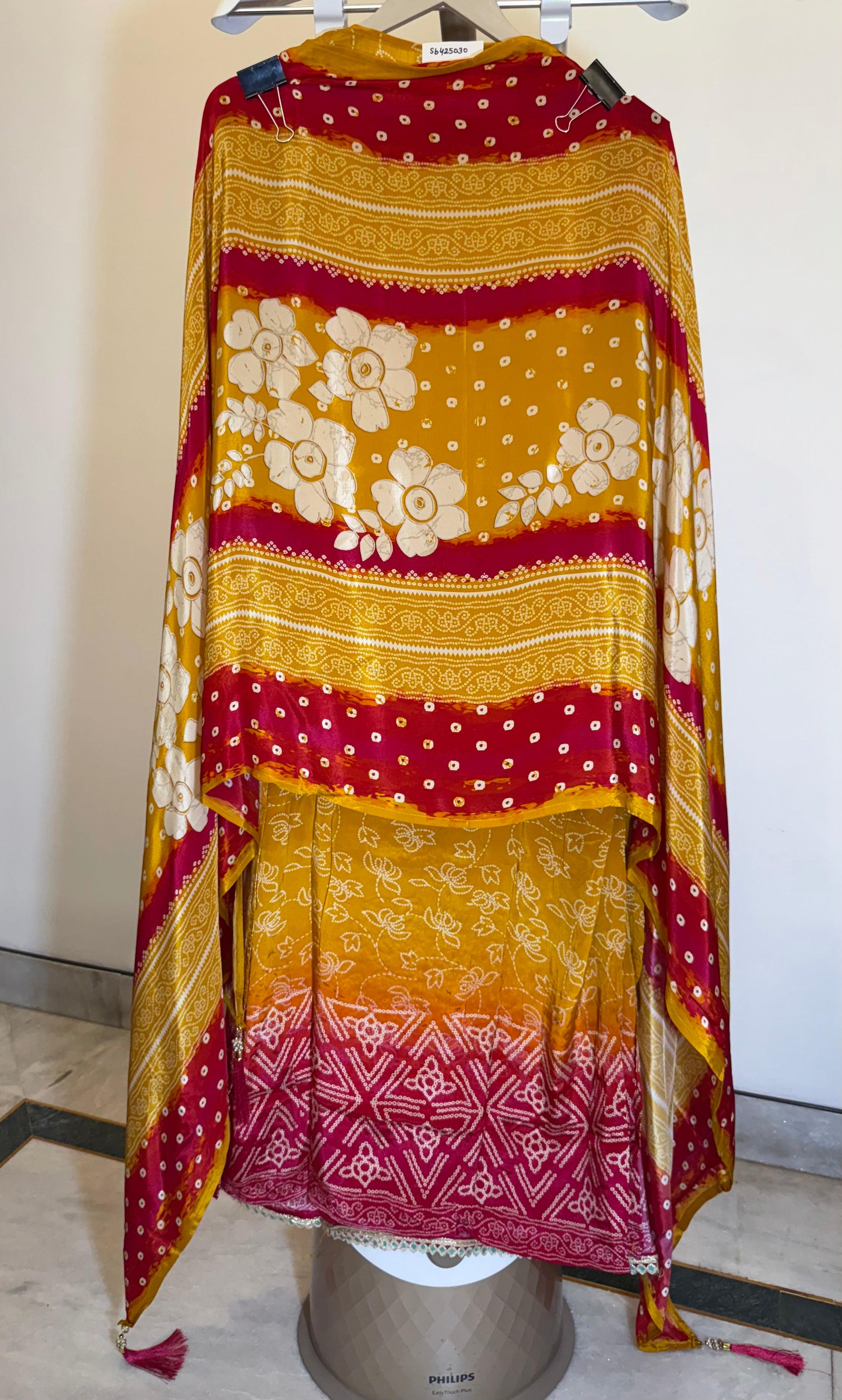 - Lightweight organza dupatta in rani-pink and marigold Bandhej stripes