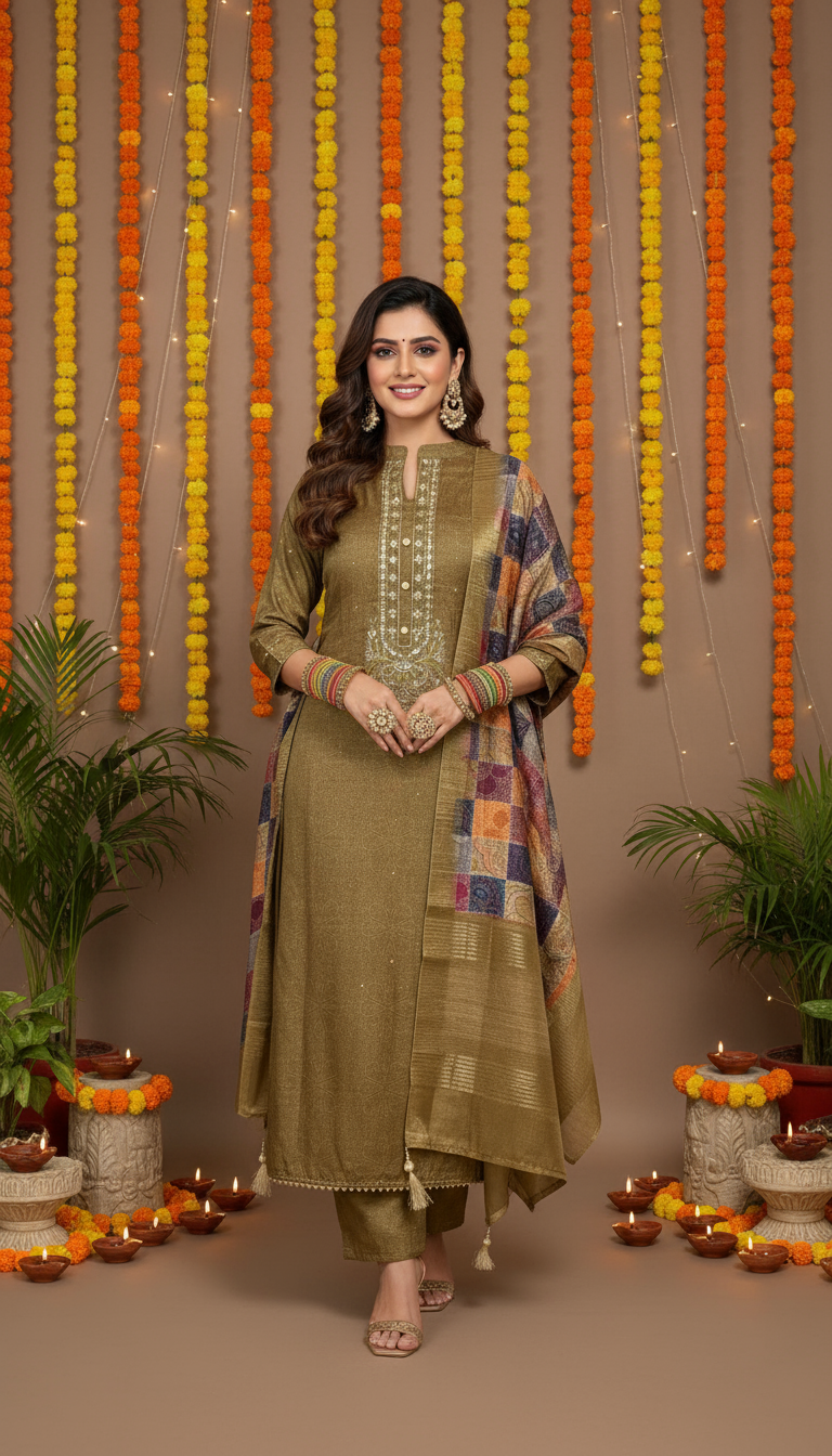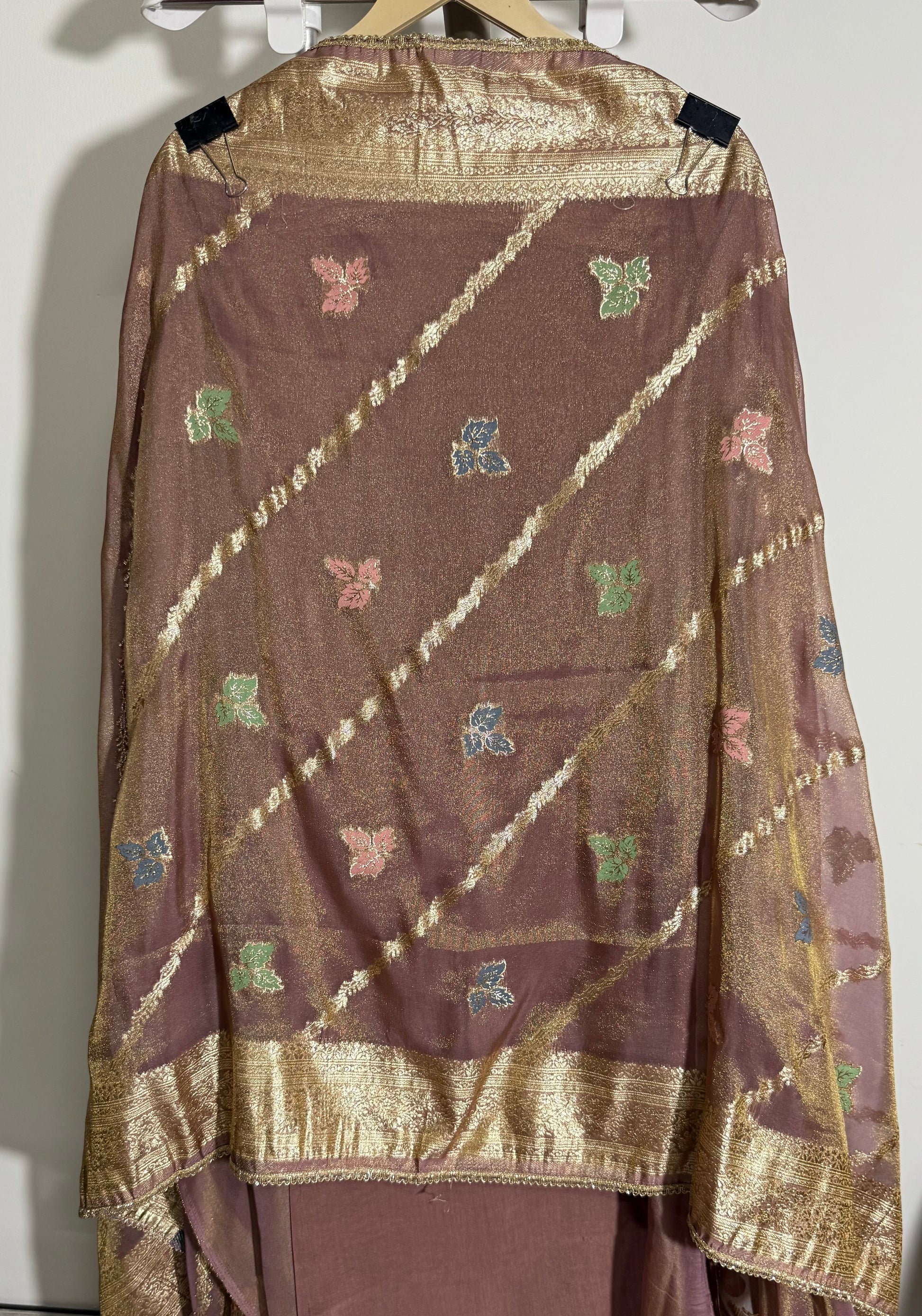Women’s Unstitched Zari Silk Suit Set with Mirror Embroidered Yoke | Solid Gold Bottom & Multicolor Banarasi Silk Dupatta – Festive & Occasion Wear