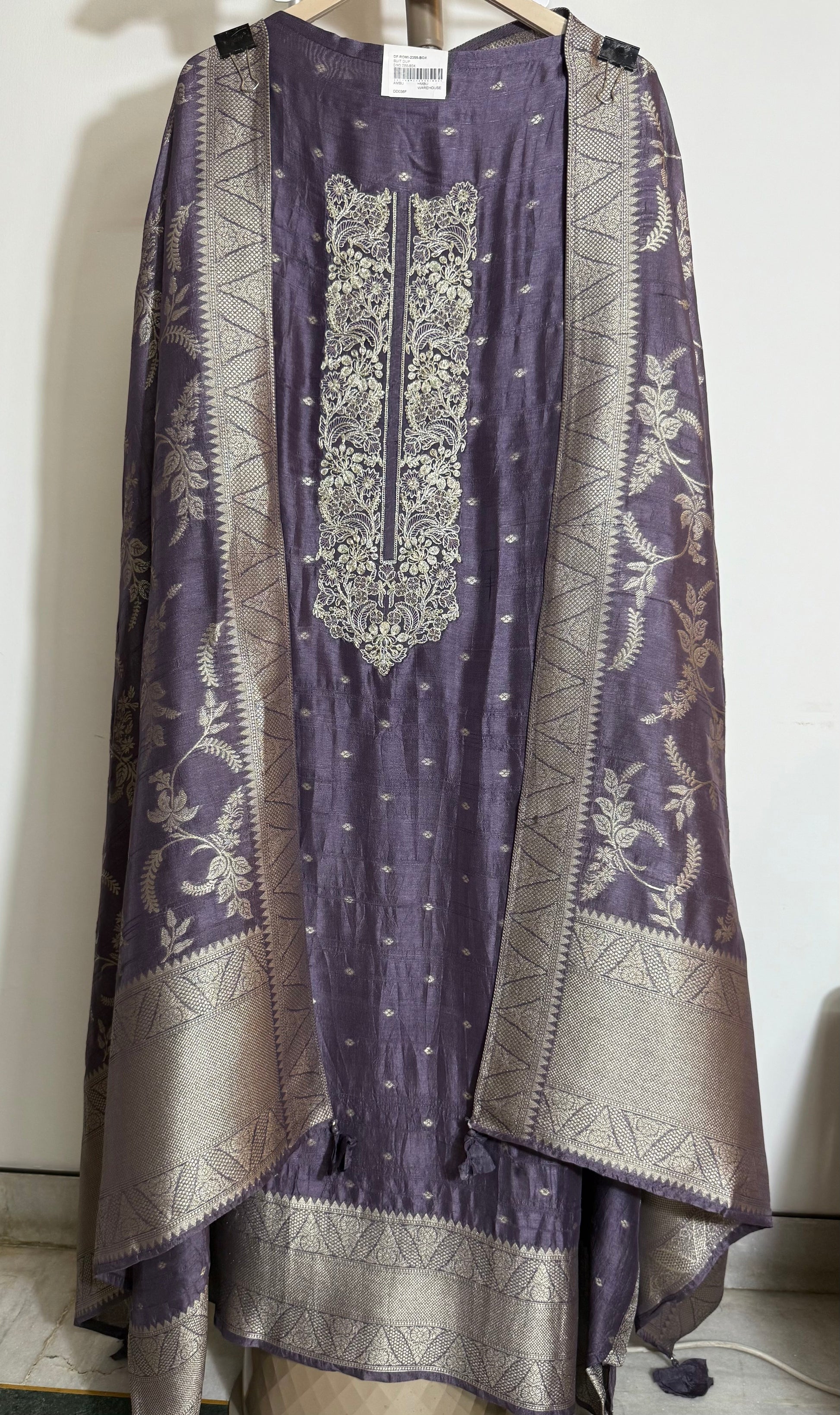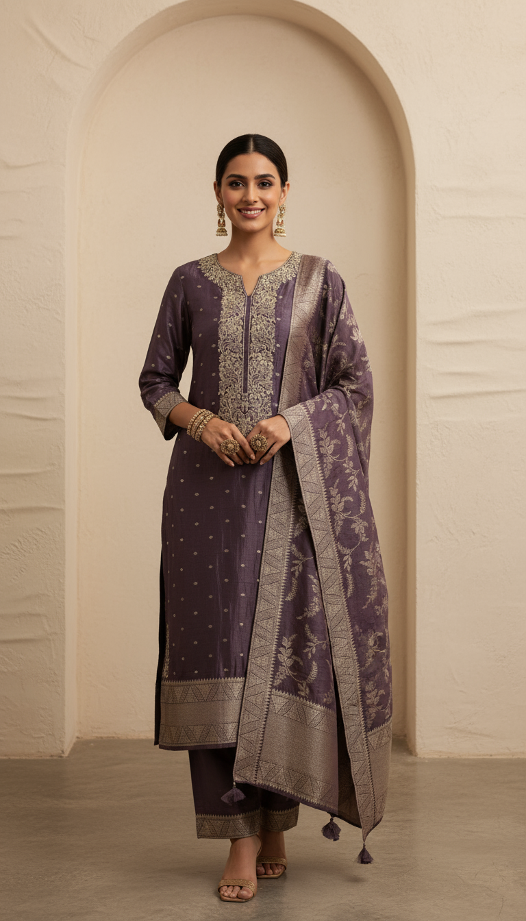 Sophistication in every thread, this lilac silk suit pairs the richness of silver zari with a breezy silhouette — perfect for festive soirées and elegant celebrations.