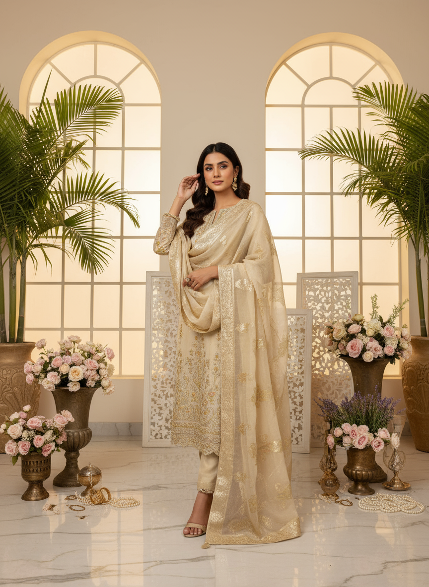 Drape yourself in pure gold – with shimmering tissue, dreamy zari work, and festive elegance, this suit is designed to dazzle at every celebration.