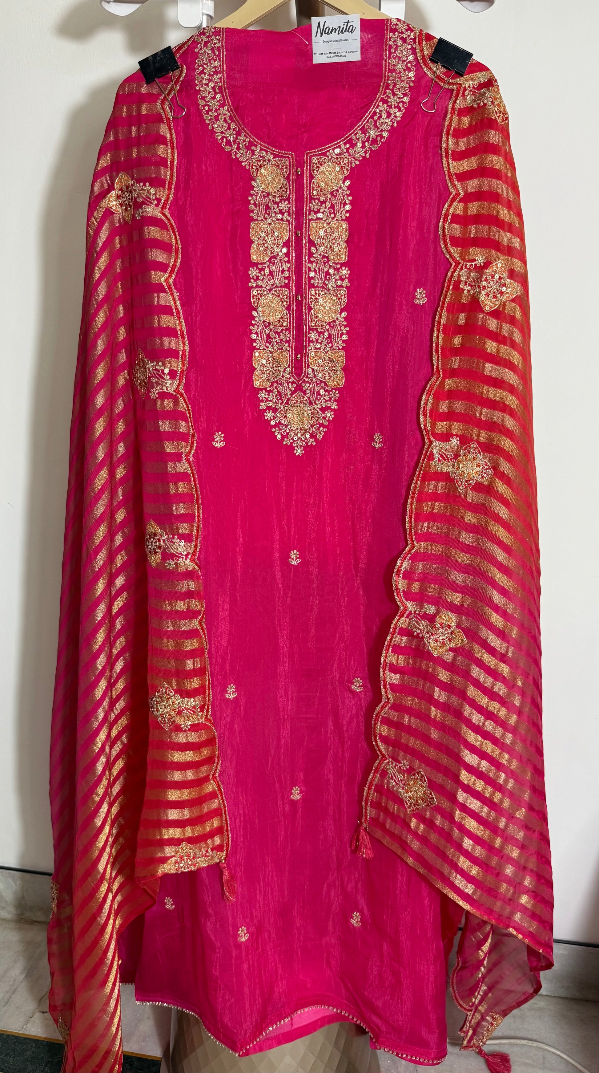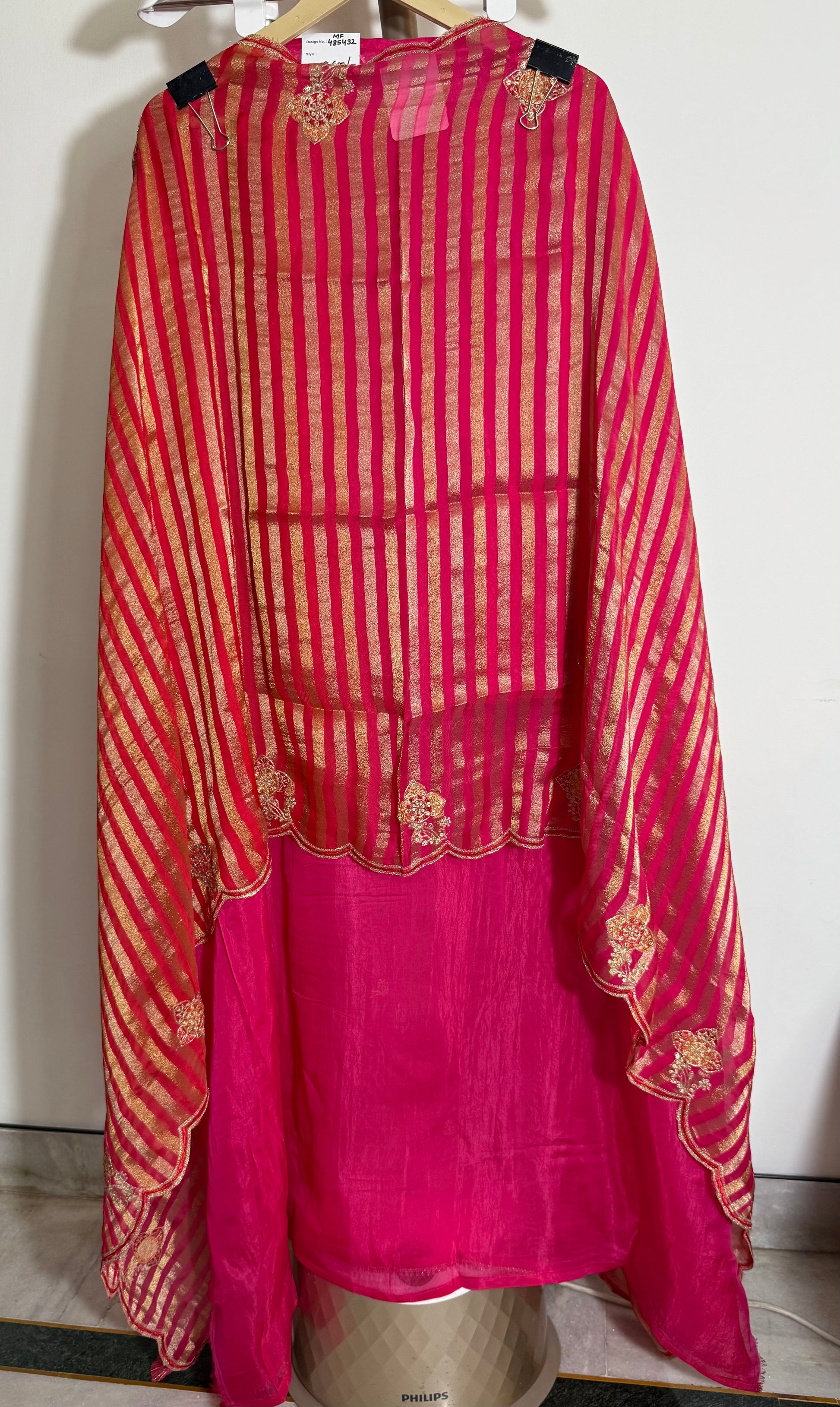 - Material & Colors: Lightweight georgette dupatta in ruby with golden scalloped stripes
