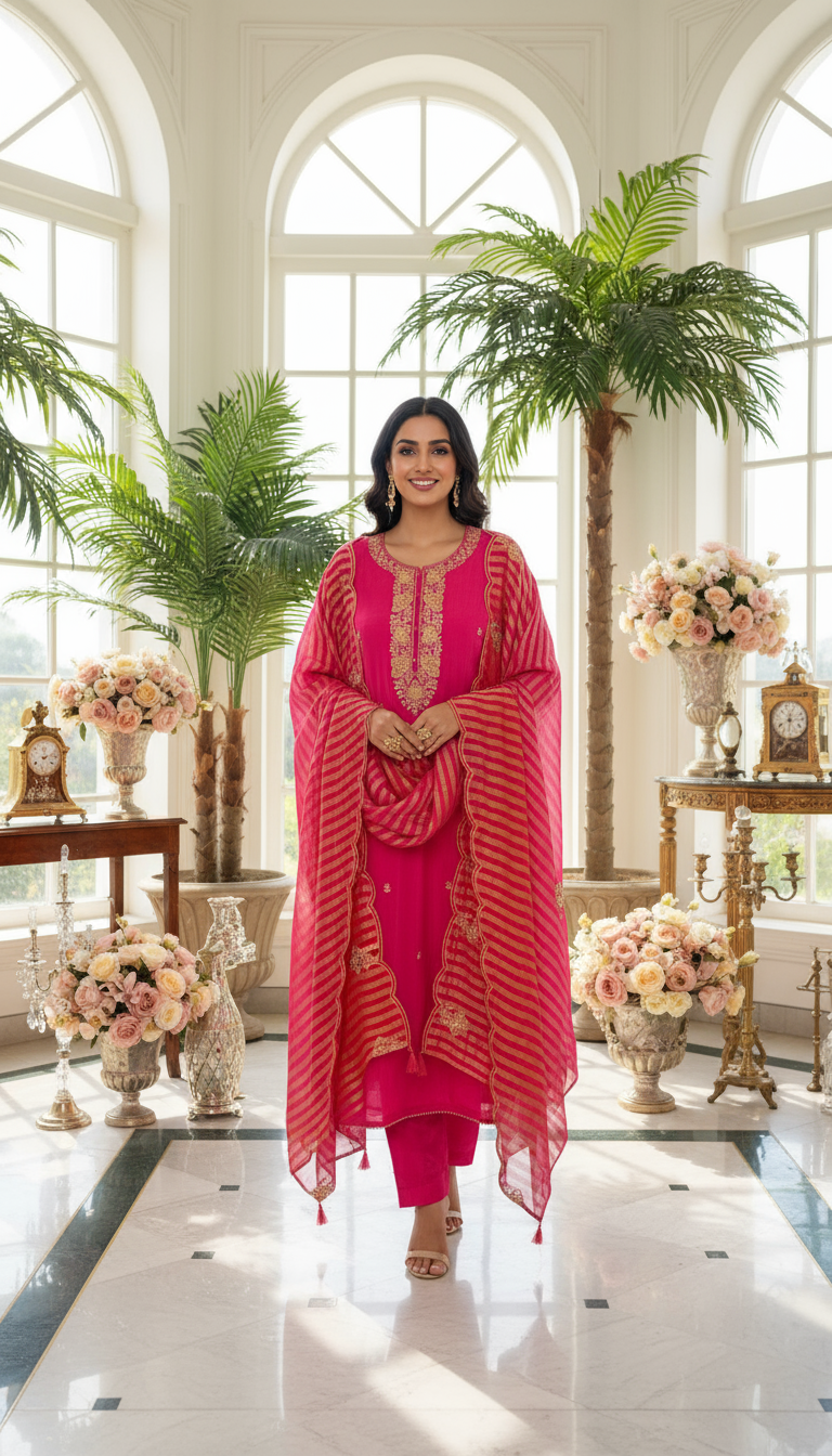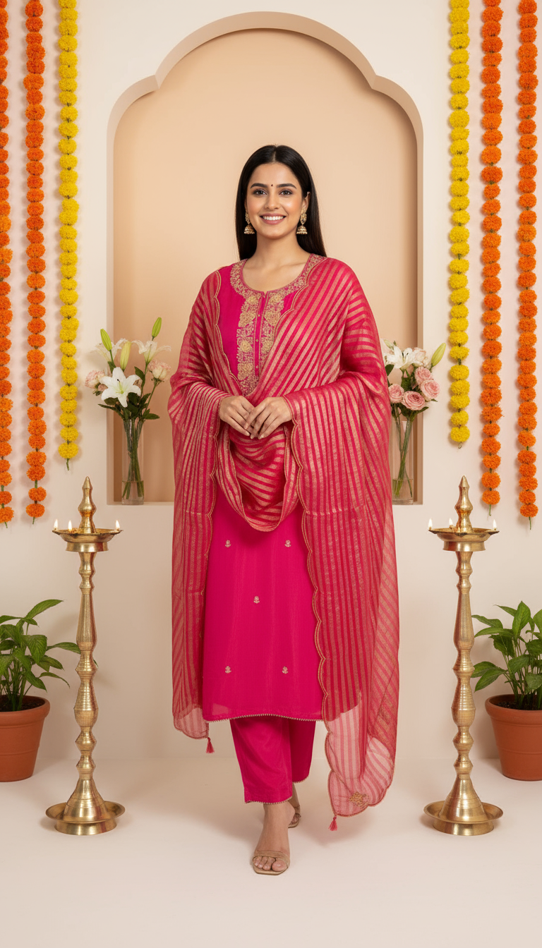 Women’s Unstitched Ruby Pink Suit Set with Zari Hand-Embroidery | Solid Cotton Bottom & Scalloped Gold Stripe Dupatta – Festive & Occasion Wear