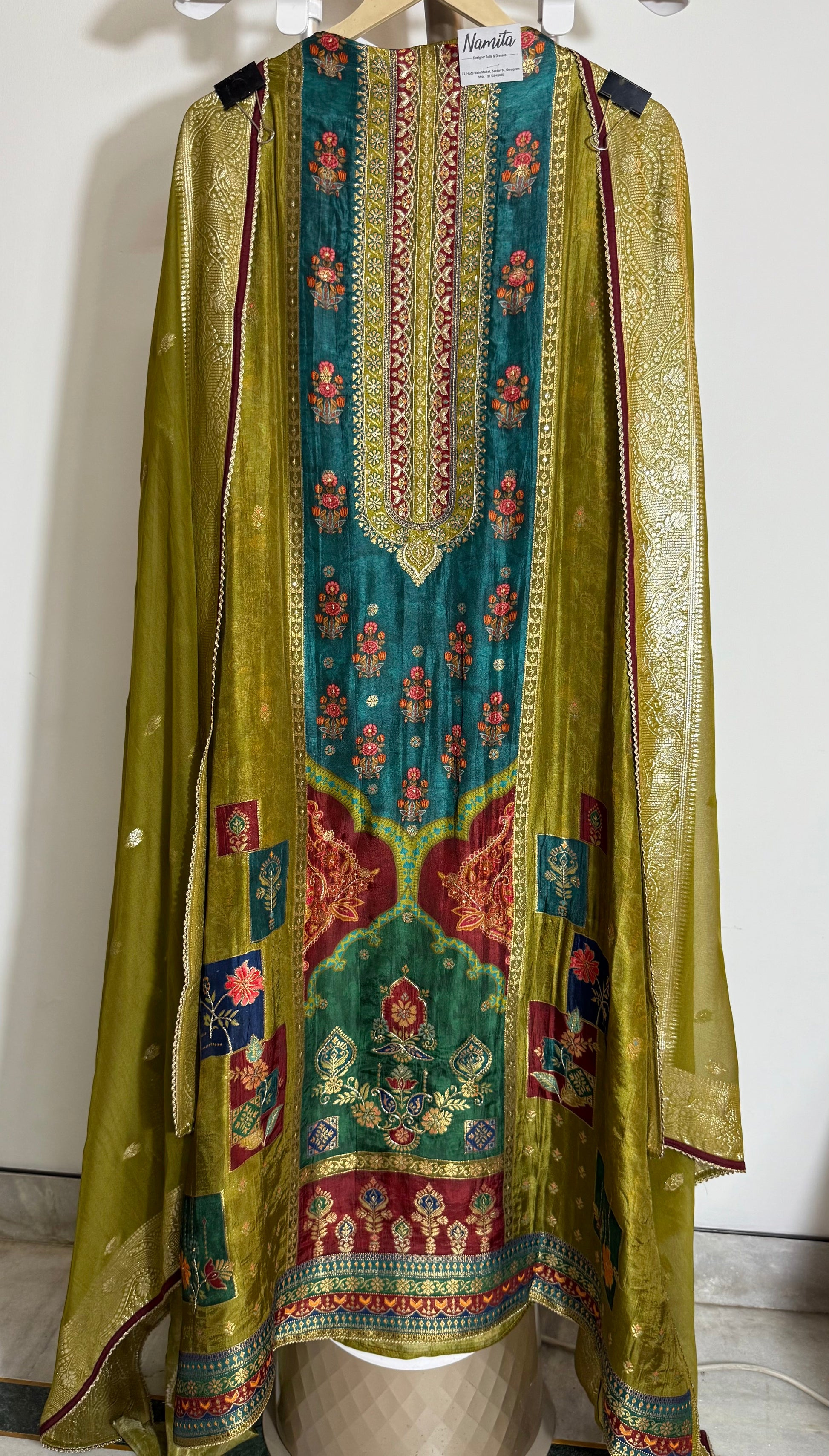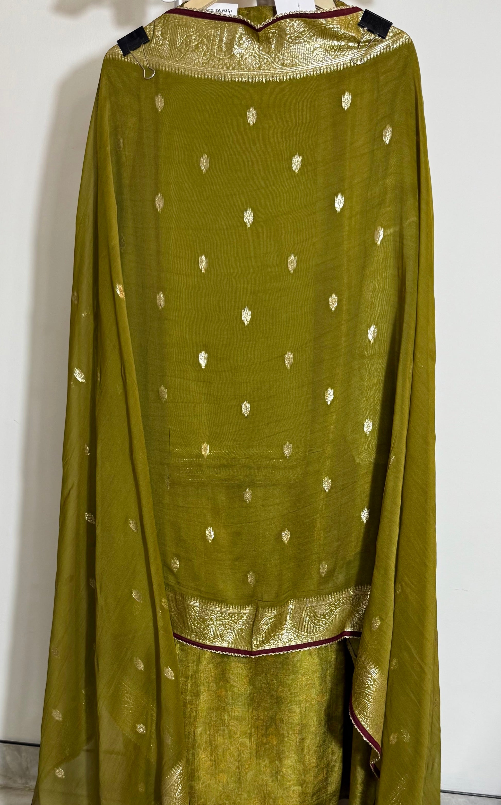 Women’s Unstitched Banarasi Silk Suit Set with Zari Embroidered Panels | Solid Silk Bottom & Floral Woven Dupatta – Festive & Occasion Wear