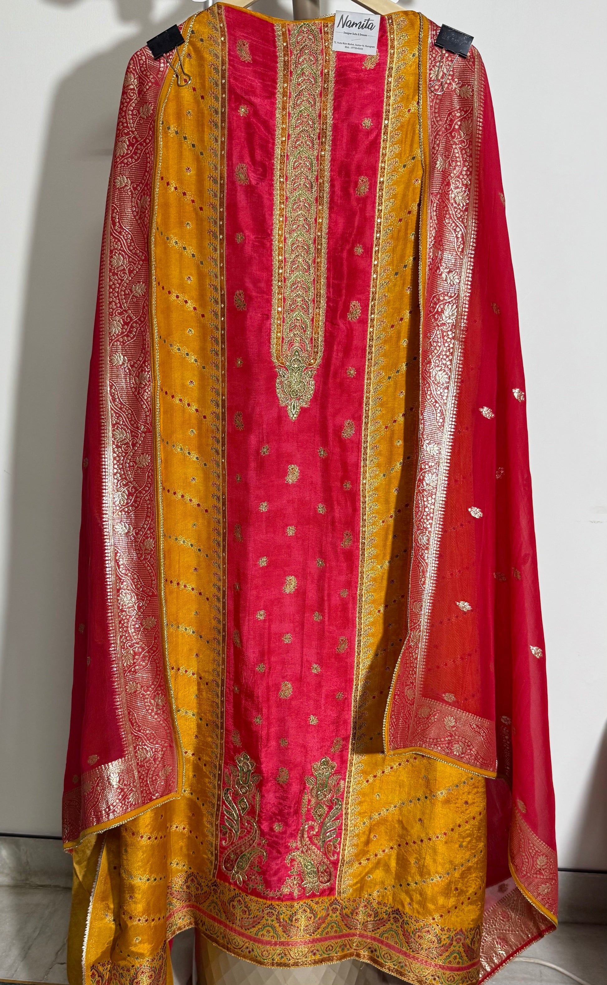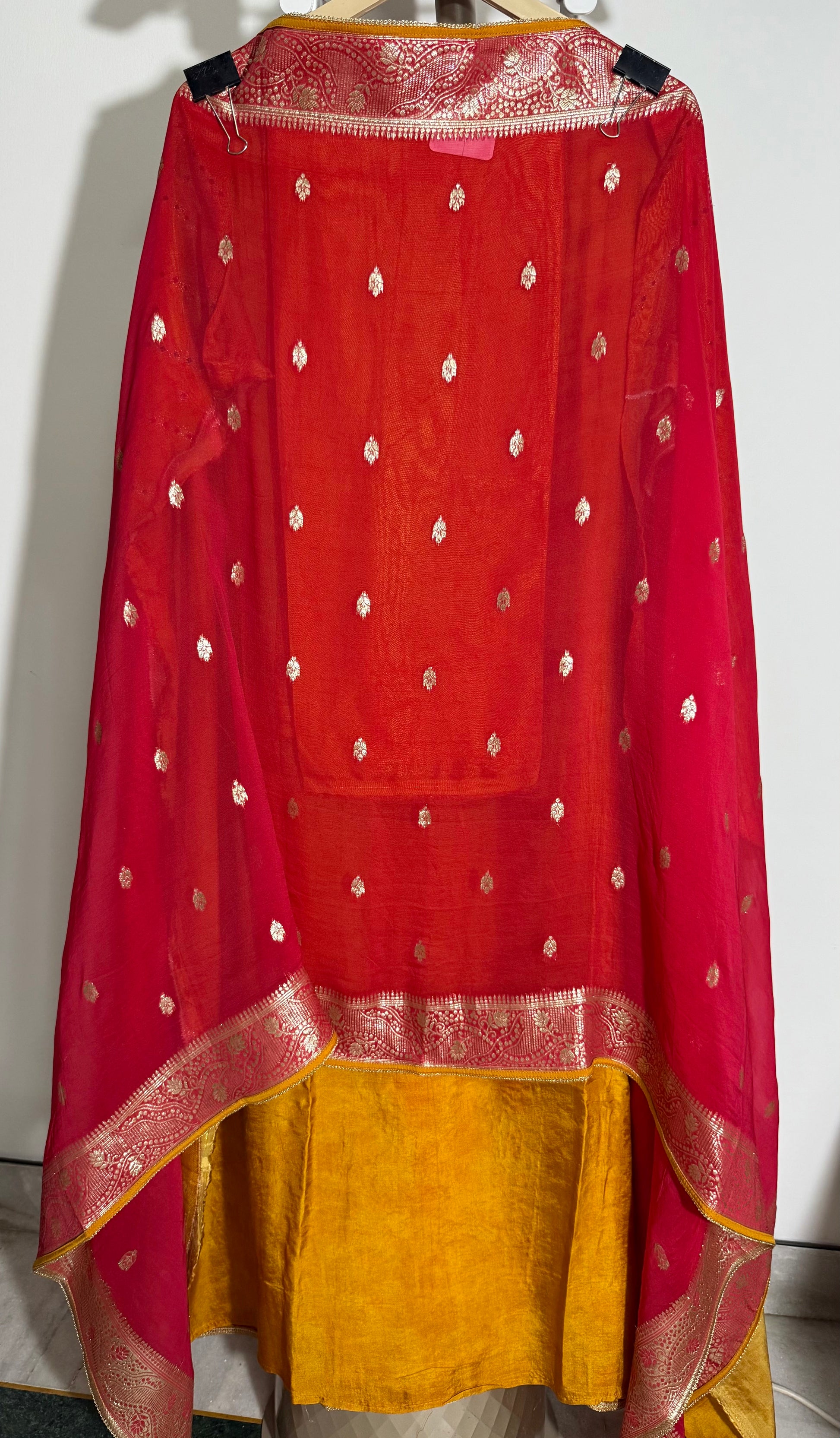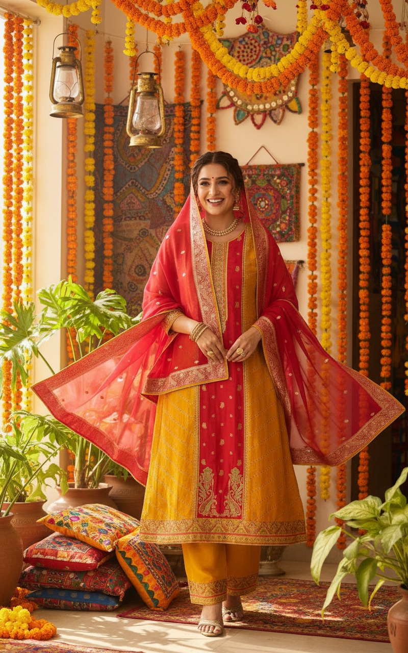 - Material & Colors: Dupatta in matching vermilion and turmeric yellow silk, adorned with gold zari buti work