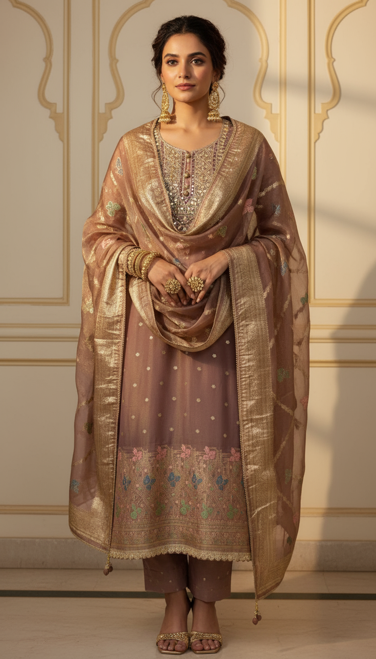 - Kurta Fabric: Tissue silk with mirror & zari embroidery